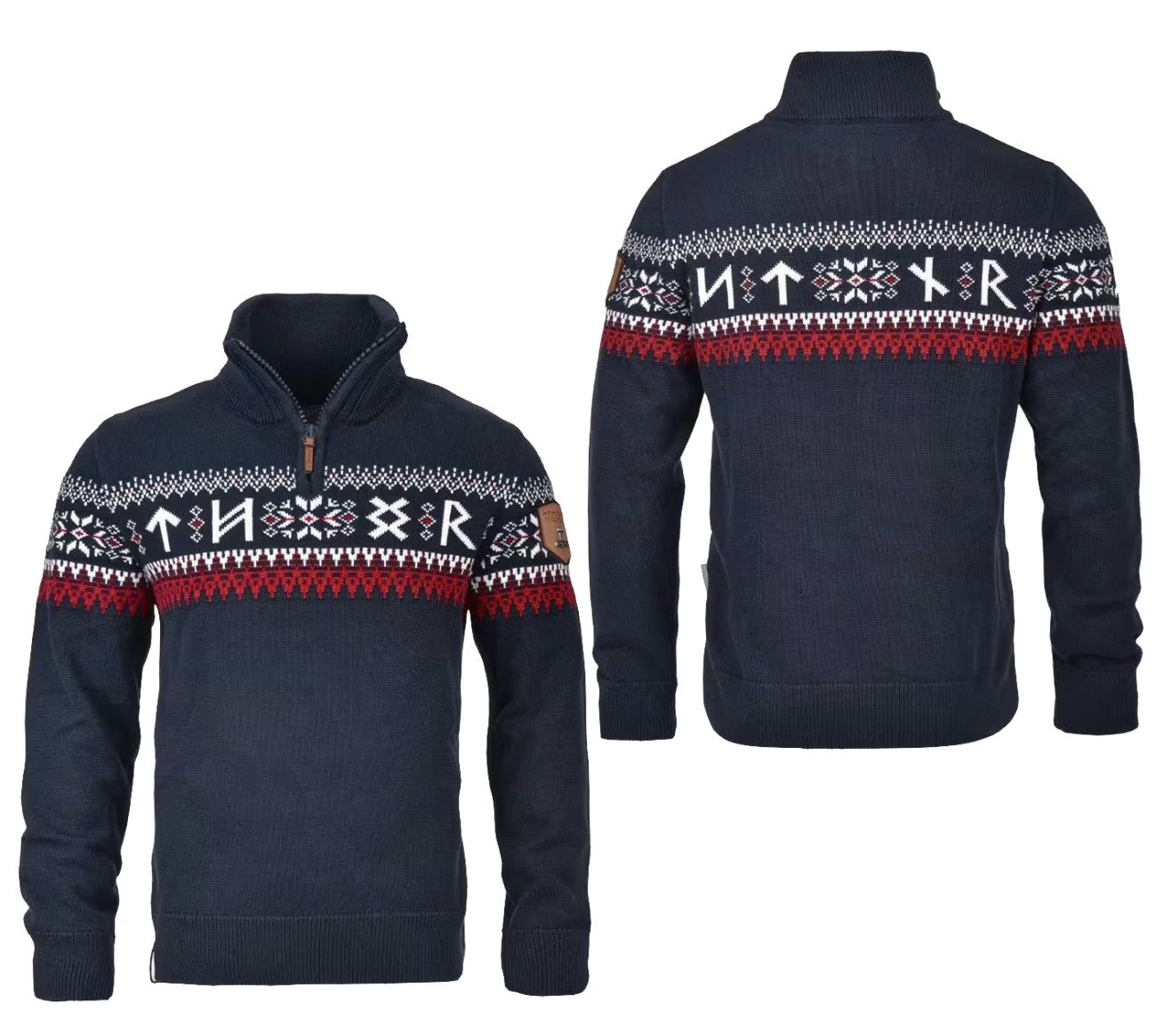 Mit diesem traditionellen Thor Steinar Norweger-Pullover zieht man alle Blicke auf sich! Hochwertige Rippbündchen an den Ärmeln und Saum und aufwendige Leder Aufnäher am Arm und unten am Saum. Vorn THOR in Runenschrift.