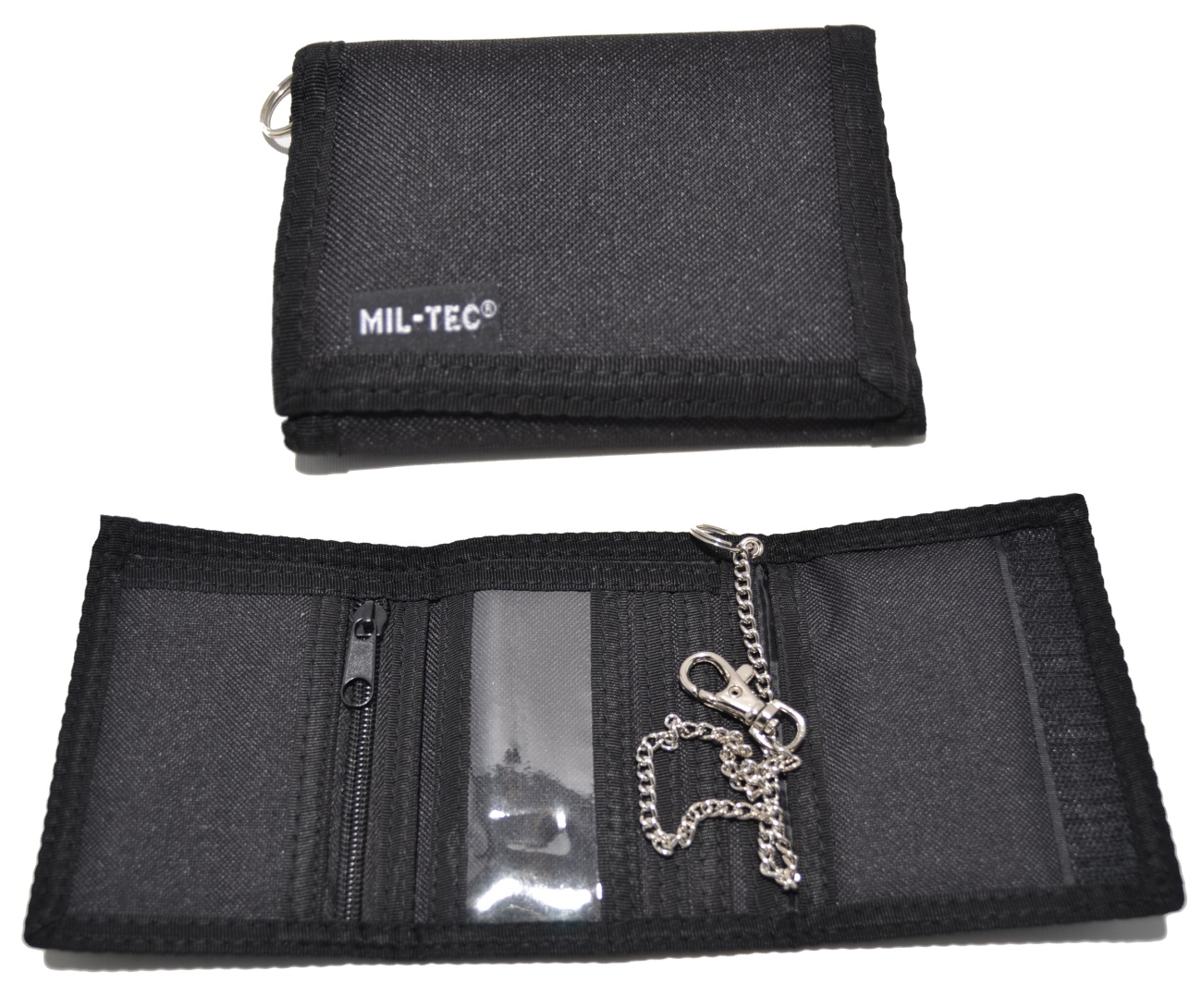 MIL-Tec Stoffgeldbörse mit Kette, Kette mit Karabinerhaken; Geldscheinfach; Münzfach mit Reißverschluss; 4 Kartenfächer; 1 Kartenfach mit Sichthülle; verschließbar durch Klettpatch